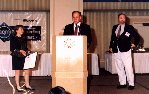 With [left to right] Esteban Hernandez (General Director of Mexican Institutes of Technology),Jesus Ruvalcaba (Chancellor of the Instituto Tecnologico de Durango),Emiliano Hernandez (Mexican Secy. of Education), Prof. Job Favela Diaz , and a veryhelpful translator, at the Annual Meeting of the Directors of Institutes of Technology; Instituto Tecnologico de Durango, Durango, Mexico October, 1996.
