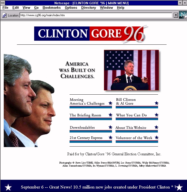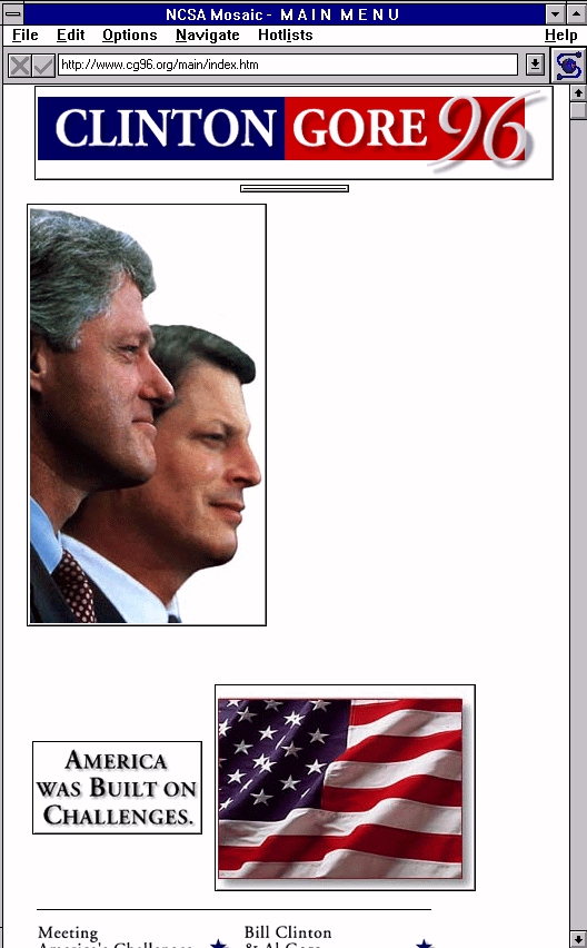 Figure 1. The Clinton/Gore splash page as rendered by Netscape 3.0. Everything is aligned nicely. A slide show appears in the window (technically a table) on the right which rotates through a half-dozen images or so every few seconds.