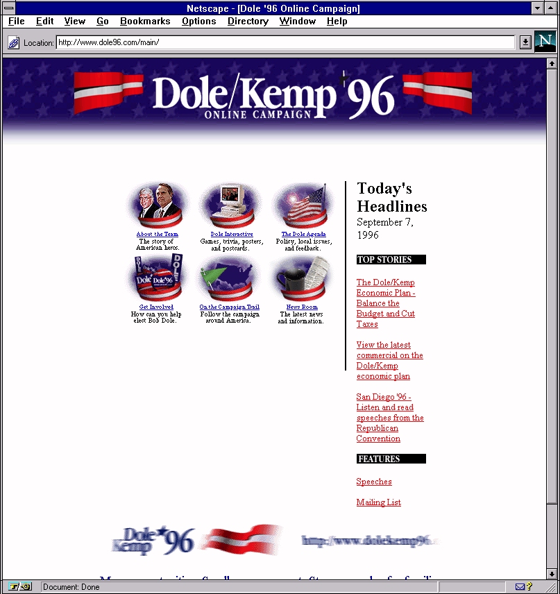 Both Republicans and Democrats have invested heavily in the development of their campaign Websites this year. Both sites seem to be professionally done. From a technological point of view, I'd give a very slight edge to the Dole site because it isn't as rude to non-Netscape compatible browsers as the Clinton site is - it at least pays lip service to the Internet Engineering Task Force (www.ietf.org) HTML standards. I'll show you what I mean with a few screen shots.