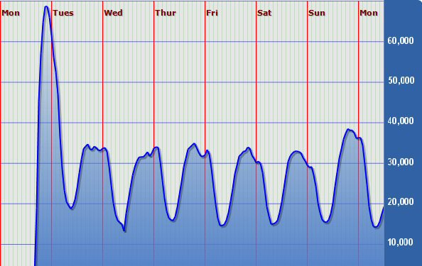 FIGURE 1:The Spread of W32/Blaster-Lovsan during the week of August 11, 2003. Note peak of 68,000 newly infected IP addresses on 11pm on Monday, August 11. Source Hackerwatch.org (hackerwatch.org/checkup/graph.asp).