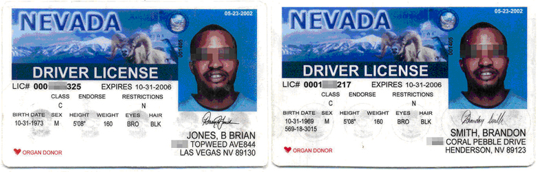Figure 1. Two Counterfeit Driver's Licenses for Same Person. Both (identities are fictitious)