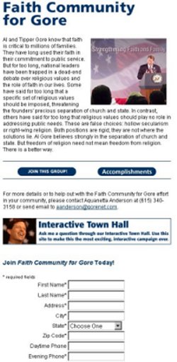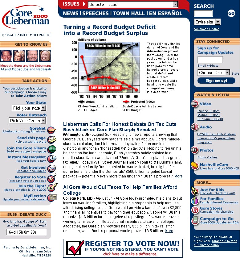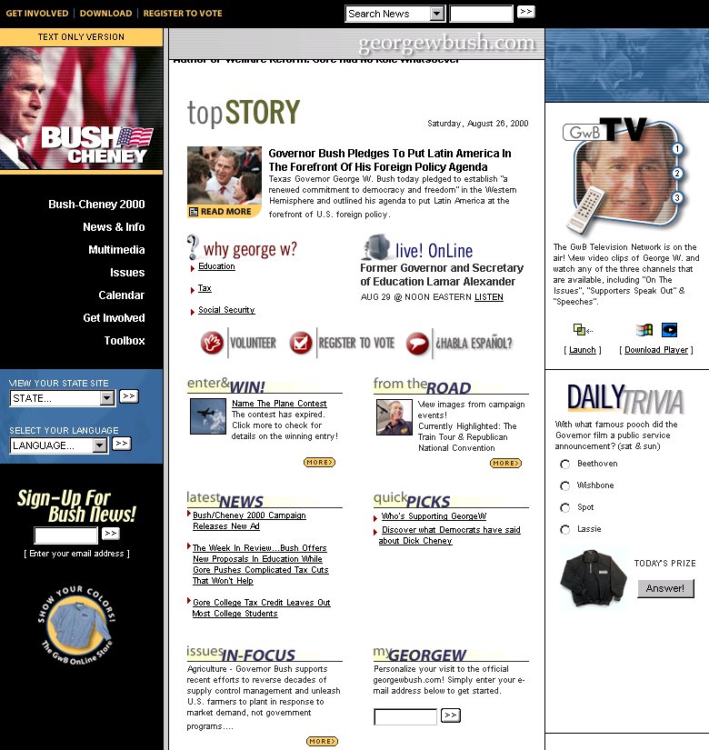So, with the possible exception of a few advances in multimedia, little appears to have changed since 1996. We still have a straightforward paradigmatic example of rectified information flow: digital bill boarding taken to an art form. Where the Gore camp has decided to throw in a little animation (e.g., the "Bush Debate Duck" window) and a Web Cam (reminiscent of such bandwidth banditry as the Cambridge Coffee Room Coffee Pot of old), the Bush folks throw in the occasional live, online audio feed from a sympathetic voice and a simple-minded CGI trivia game. From a technological point of view, there's nothing that even pretends to be innovative on either site. In 1996 I said: "After visiting a few hundred political Web sites, the adjective "uninspired" comes to mind." Nothing has changed so far as I can see but a few extensions in the gratuitous use of multimedia.