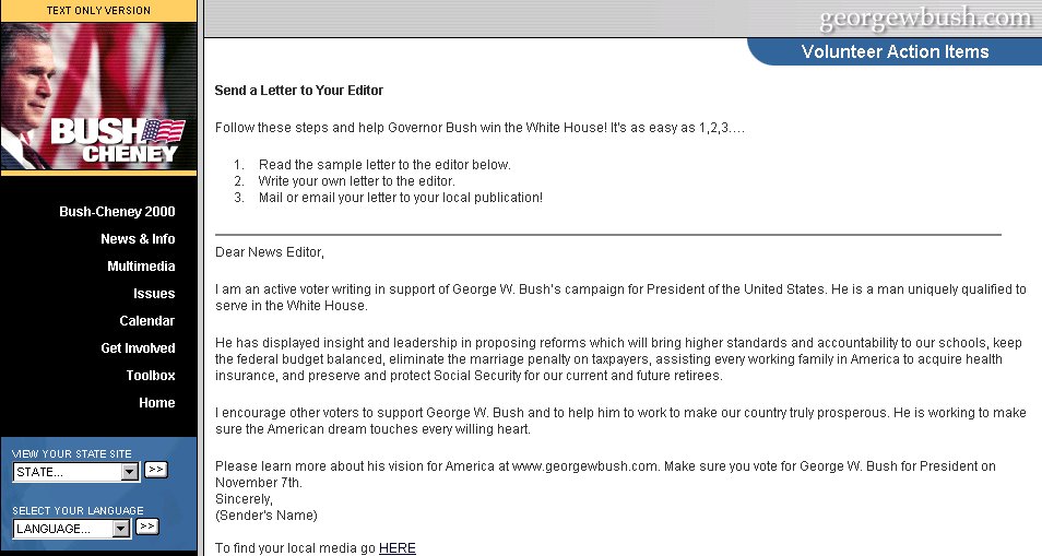 Automated spin doctoring, however, is taking place as I predicted. For example, click on the Bush site's "Action Items" pop-up window "Send a letter to your Editor" option (see Figure 3). Note the "canned" letter. Just imagine the absurdity of the op ed page of your newspaper filled with n tokens of this same letter, each bearing the name of a different author. This idea has to be targeted for a constituency of room-temperature IQs. Overcome by a willingness to make a positive contribution, I herewith propose the innovative concept of "political spin numerology (PSN)" whereby each editor assigns a unique code to each hyperlinked, canned letter - e.g., "Bushwhack 407b9," "Goreibund A9v" and build the running tallies into their op ed pieces. Imagine William Safire saying "... who among us would consider 419 "Bushwhack 64s" as compelling in the light of 300 "Goreibund 9s" against a backdrop of 100 solid "Hillary 36b7s."" The potential for rhetorical parsimony is truly inspiring.