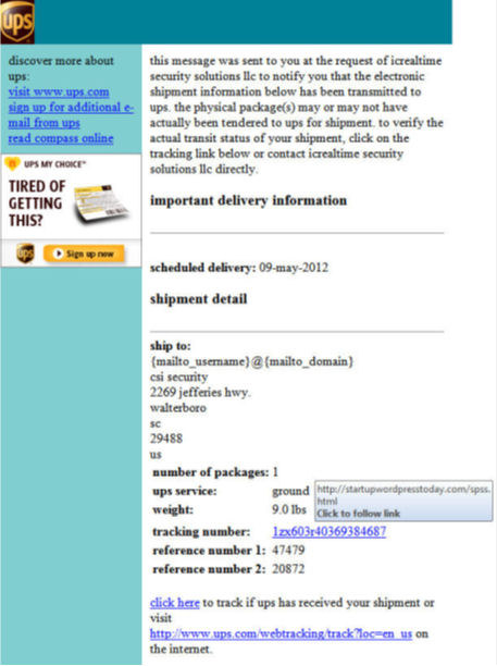 I next offer Figure 2 for your consideration. I've received literally hundreds of these bogus UPS notifications in the last few months – I'm about to drown in digital brown at this point. Take a look at this absurdity. Note that the target is {mailto_username}@{mailto_domain}. C'mon script kiddies, learn about the operation of scripting variables before you use them. Note also that the tracking number link to the malware that starts the infection cycle is startupwordpresstoday.com/spss.html. Now what is the chance that UPS will store their tracking number database on startupwordpresstoday.com which, incidentally, is registered to a Houston P.O. box of a bogus Hotmail account holder)? Call me crazy, but I have a hunch that UPS doesn't use hotmail account holders as their registrars of record. As an aside, all links on the page but the last point to the same malware – a technique which, for want of a better phrase, I'll call phishing by snaglining. By the time that this sub-cerebral phishing effort reached me, the DNS records had already been pulled and the domain name appeared on several blacklists.
