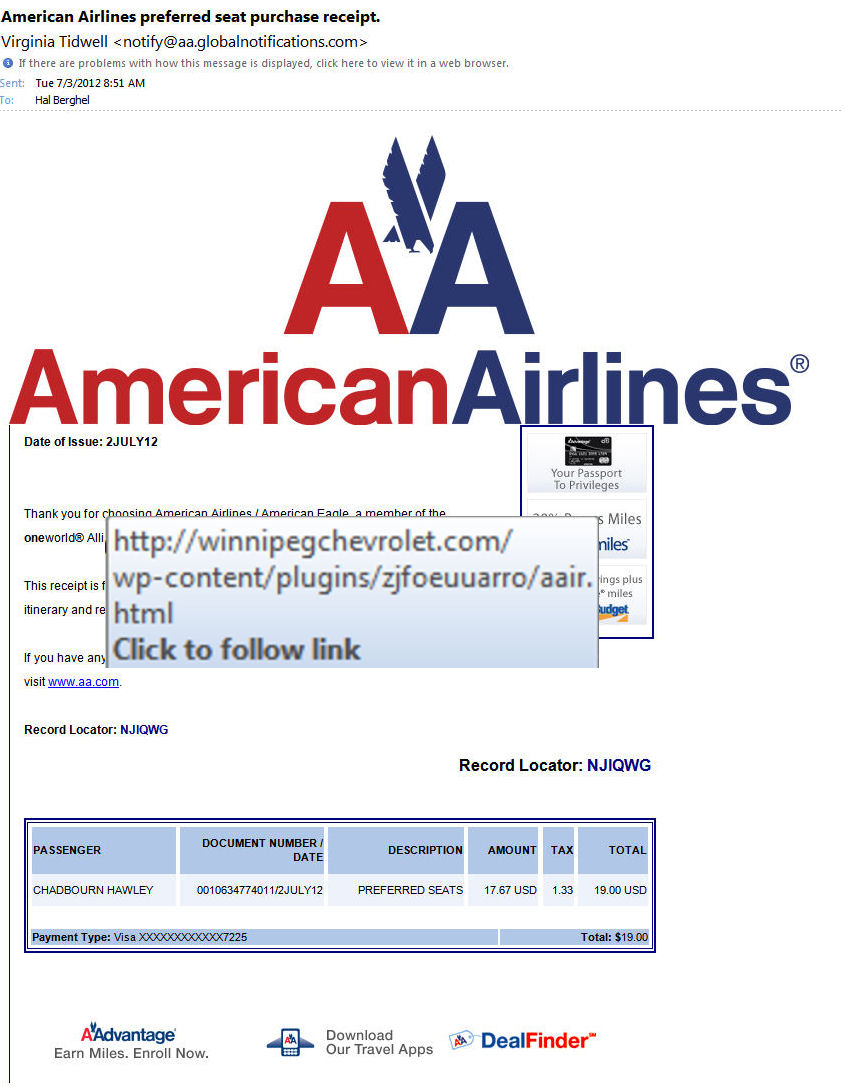 For the most part, current phish bait stinks. It’s too brutish and lacks any semblance of creativity or sophistication. This betrays a serious dumbing down of phishing generally, which now seems to be almost exclusively in the hands of unenlightened script kiddies. This wasn’t always the case. Five to ten years ago I would receive a continuous stream of grist for my network forensics students’ lab assignments. The latest offerings are too lowbrow for even neophyte students.