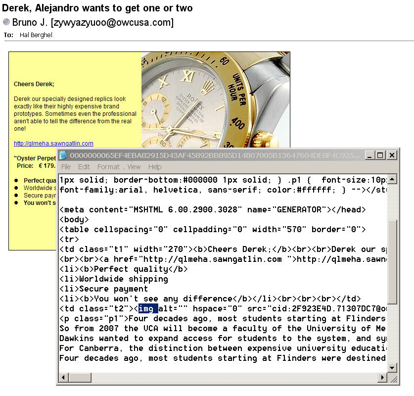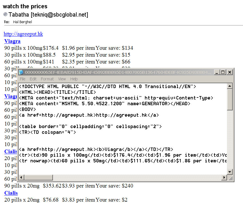 We note that the spam is formatted in HTML for convenience, probably by a Microsoft product. No Dreamweaver needed in this app.