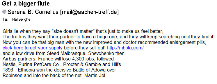 I begin with a modest example. Figure 1 is an example of generic spam. Nothing imaginative, just pedestrian spam to sell potency pills.