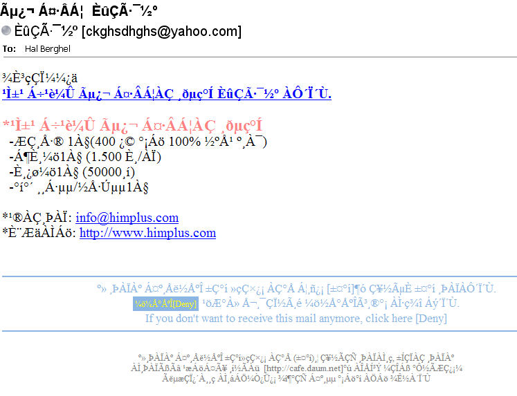 We'll conclude with a recent trend – spamming the world with unusual character sets (Figure 4). This is our vanilla, with chocolate chips and fish bait. Look at the opt-out link at the bottom. Is this reasonable and prudent? Nope, because the email addresses from responses are likely harvested and re-sold or traded. Spammer “opt-out” links are never to be trusted. Why? Because responses are proven “hot links”- the only way that the user could elect to “opt-out” is if the spam got through. In other words, by “opting-out” the user is actually “opting-in.”