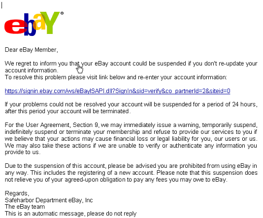 A more-or-less typical fishing exploit appears in Figure 1. In this case the Phish is an email (technical subterfuge) with an apparent invitation by an online auction house to update account information (perception management). The victim is enticed to do so because it is natural to want to ensure that one's personal accounts are accurate (social engineering).