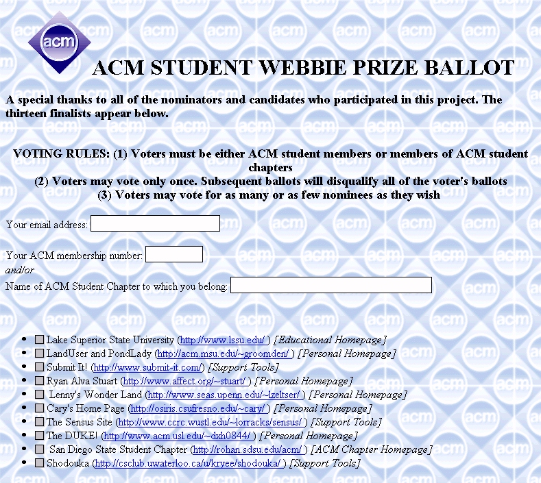 Dave Oppenheim (who succeeded Poucher as LAB chair) and Joe DeBlasi were always open to my ideas – no matter how unusual - and managed to find ways to help me fund them. One early project I did for ACM was the ACM Webbie Prize for noteworthy ACM student chapter and student chapter member websites that I created in the mid-1990's. There is an interesting story behind this. First, I originally called it the ACM Webbie Award, launched it, and started giving away recognitions to chapters, but after the first year Pat Ryan informed me that only the ACM Council could use authorize “awards” and I hadn't bothered to consult them. My bad. So I had to change the recognition to the “Webbie Prize”. Second, our Webbie preceded the Webby Award by quite a few years. By the time the Webby came along, we had already given several of our Webbies to ACM student chapters. In retrospect it would have made sense for me to have had the term trademarked on behalf of ACM but I never thought in those terms. Third, the ACM Webbie prize winners were determined democratically by online vote. All ACM student chapter members were allowed to vote on an online ballot of candidate website URLs. That necessitated the development of a CGI online voting site which my students and I developed and put on ACM.ORG. This ACM online Digital Ballot Box was used for all of the Webbie competitions that I oversaw. [cf. ACM Webbie Ballot - IMAGE ATTACHED] After a few award cycles, I turned over the entire Webbie project to the student volunteers who were involved in the Crossroads effort where it died for reasons unknown to me. While we're on this topic, I worked with the Student Chapters in Mexico that I helped create and bring into ACM to create the first foreign language (Spanish) edition of Crossroads. I always felt that the idea of an award for web creation was something the ACM should take an ownership in, and the Webbie was a uniquely ACM product. I remember suggesting to Joe and Wayne Graves that ACM should retain and date stamp such innovations to prevent future patent infringement claims. I'm certainly no patent attorney, but it was my understanding that if ACM could document that they were using a technology prior to the issuance of a patent, they could continue to use it without fee. But, no one seemed too concerned, and the web award that comes to mind today isn't ACM's Webbie.