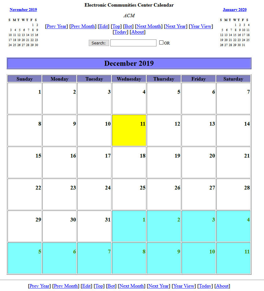 Along with some students I next created an ACM KIOSK that featured three innovations that I found inspiring. First, it had a permanent online calendar that could be personalized for all ACM members so that they could choose conferences, events, publications, elections, etc. of interest that would automatically be entered in their personalized calendar as they were announced by ACM HQ. The member could then log into ACM.ORG, look at their calendar, and choose the ACM products and services that they wanted to populate their personalized calendar. The prototype, called Dynacal, was jointly developed with one of my graduate students, Pawel Wolinski, and a colleague, Doug Blank, and worked splendidly. [ACM CALENDAR -IMAGE ATTACHED] The only problem with the prototype was that it was CGI-based (that was how web interactivity was handled in those days), so it wasn't scalable as all of the calendar data would have to reside on the ACM servers. When I demonstrated this for MAB, I pointed out that it couldn't be ready for prime time until we could figure out a way to offload the code via client-resident scripting. I still think the idea was a winner.
