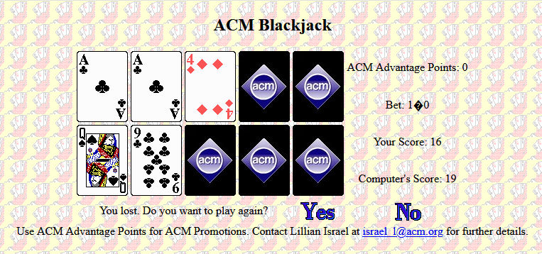 The third KIOSK feature was ACM Blackjack which I created to engage ACM prospects. [cf. ACM BLACKJACK - IMAGE ATTACHED] You could play online blackjack for “ACM Advantage Points for ACM Promotions” under your name - every 1000 points would entitle you to a complimentary copy of a magazine, journal, coffee mug, ACM T-shirt (which I developed for student chapters – I also took ACM into the clothing business!) etc. I remember when I demonstrated this for LAB, that Joe DeBlasi was concerned. He didn't think ACM should be associated with gambling. I didn't see a problem, but then I live in Las Vegas. I thought highly of the KIOSK, but I batted 0 for 3 as far as further support from ACM was concerned. Two final comments on the ACM KIOSK: First, these interactivities were done in the 1994-5 time frame and in my opinion still stand the test of time. They are/were worthy of ACM development as all of the ideas are now web standards and represent missed opportunities. But others saw it differently, so there you have it. Second, for historical reasons I wish that more of these online resources were maintained and date-stamped on ACM.ORG servers. I suggested that to the ACM leadership without effect. Unfortunately, only a few fragments remain and so this online legacy is largely lost. In addition, were they preserved and maintained ACM could legitimately claim innovation credit. I have been contacted by law firms over the years who wanted me to document our ACM Blackjack development with the goal of helping them contesting some of the online gaming patents. I have always declined such expert witness work as undignified, so I declined. However, it might have been useful had ACM chosen to stake out a few of these claims even without benefit of patent.