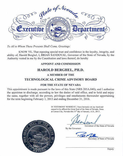 - Apointment to the Nevada Technological Crime Advisory Board, December16,2011