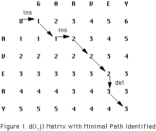 Figure 1 shows the d(i,j) array for determining the edit distance between the strings "AVERY" and "GARVEY".