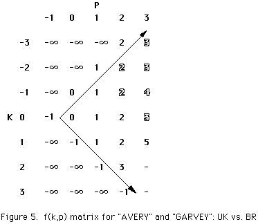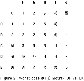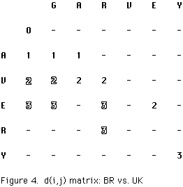 Figure 4 contains the combined UK and BR d(i,j) arrays resulting from a comparison of the strings "AVERY" and "GARVEY". It illustrates how fewer d(i,j) values are calculated by BR for the sample strings.