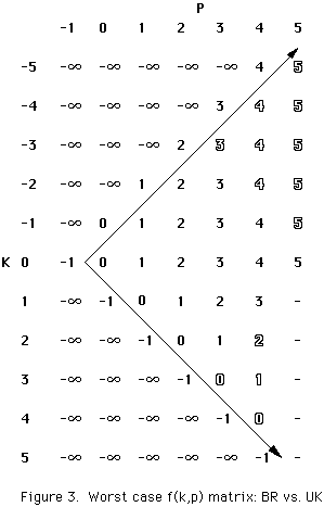 The formula restricts the range of p for a given k beyond that of UK. As a result, BR, which enforces the formula's constraints, calculates on the average fewer, and never more f(k,p) values than UK. Algorithm BR is as follows: