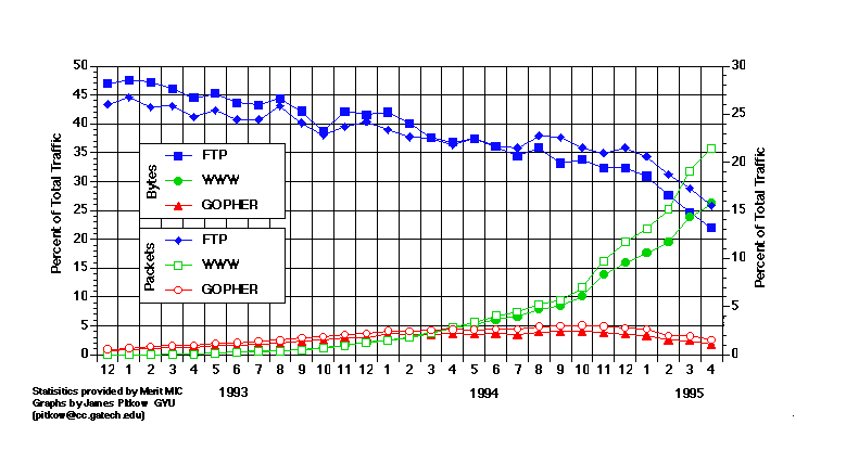 Figure 1 plots the recent evolution of the Web, Gopher and FTP as a percentage of overall network packet transmission and volume of information along the NSFNET backbone. This is the most recent data available since the NSFNET has subsequently changed to a distributed network architecture involving multiple Network Access Points (NAPs).