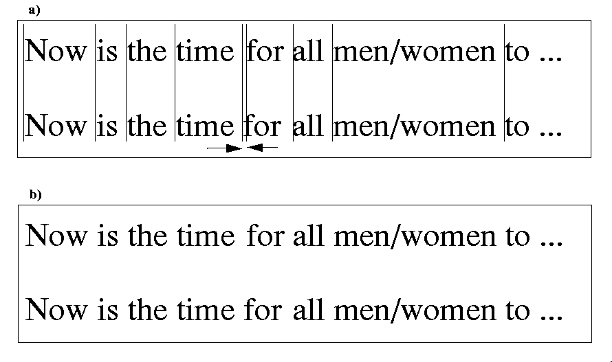 Watermarking can be applied to text images as well. Three proposed methods are: text line coding, word space coding, and character encoding. For text line coding, the text lines of a document page are shifted imperceptibly up or down. For a 40-line text page, for instance, this yields 2**40 possible codewords. For word-shift coding, the spacing between words in a line of justified text is altered (see Figure 3). For character coding, a feature such as the endline at the top of a letter, "t" is imperceptibly extended. An advantage of these methods over those applied to picture images is that, by combining two or three of these to one document, two documents with different watermarks cannot be spatially registered to extract the watermark. Of course, the watermark can be defeated by retyping the text.