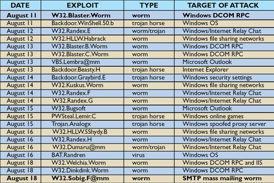 To provide some estimate of the "TCH" (total cost of a hack), consider the following list of exploits during one week of August, 2003.