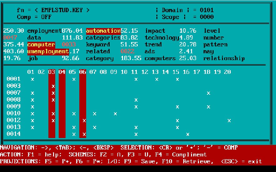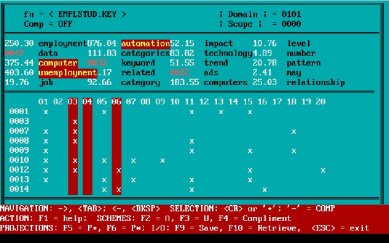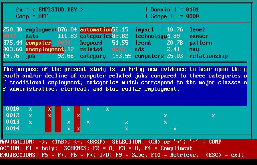 First, by this time we had developed a "text algebra" that drove the creation of the document extract (see bar at bottom of screen). The 20 columns in the main "window" correspond to the keywords listed above. The numbers after the keywords denote a relevance "weighting." Several algorithms were used for this purpose over the years, including comparison against standard word frequency calculations (e.g., the Brown Corpus). These "weighting" measures could be toggled off-and-on at will. The color of the keyword relevance value signified the algorithm used in determining its relevance.