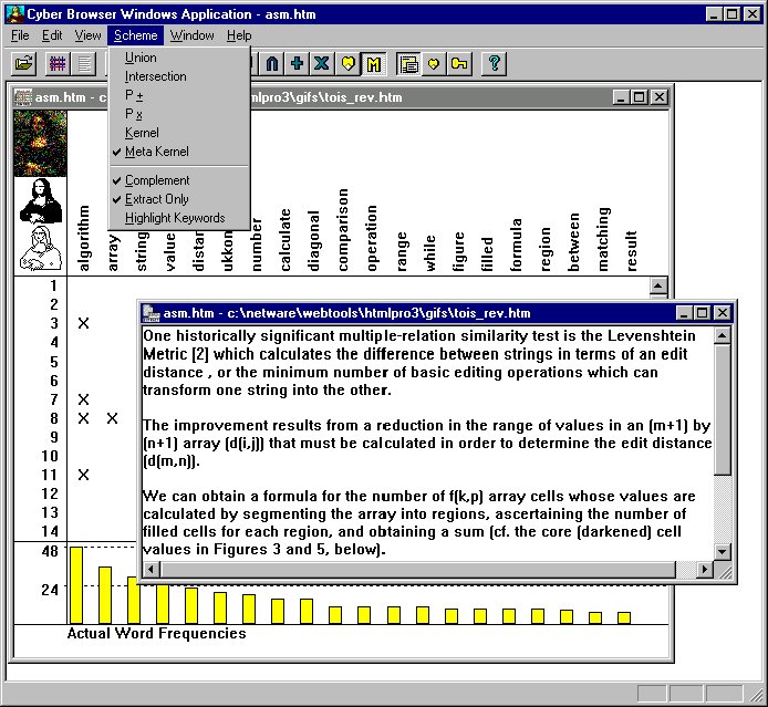 Figure 4 shows how the interface and functionality had evolved by the mid-1990's. By then, Windows was the dominant operating system on the desktop, and plug-ins had displaced helper apps as the de facto standard browser launchpad. One observes that the text algebra had been extended to include a variety of fully-automated features producing document "kernels," "meta-level kernels," and so forth.