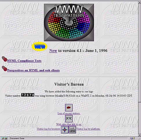 Figure 1 is the homepage of the Web Test Pattern in its current incarnation (as of June 1, 1996). The splash page encourages navigation to one of three resources: the most recently added compliance tests, the main compliance testing cybersphere or background information. These are the resources most likely to be used by the frequent visitor, the infrequent visitor, and the newcomer, respectively. The "visitor's bureau" augments more-or-less standard CGI "welcome-message-plus-guestbook" fare with useful statistical summaries of the browser types and host operating systems of the Test Pattern users.