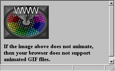 The core of the Test Pattern are the individual tests. Figures 2a and 2b illustrate the effect of a test on individual browsers. Figure 2a is an animated GIF file as rendered on NCSA Mosaic, version 2.1. Figure 2b is the same animated GIF file as rendered on Microsoft's Internet Explorer, version 3.0 beta. Although there is no way to tell from these still shots, Figure 2b is actually only one frame of an animation. The image in Figure 2a is all that there is for Mosaic - not only doesn't the browser animate the media, it doesn't reproduce the color of the first frame.