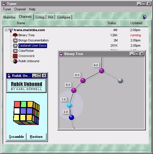 Within the past year several prototypes of solicited push netcasting have been deployed. Some, like Pointcast, consolidate and distribute information via a proprietary server-"transmitter". In this case, the client-side software behaves as a dedicated "peruser" for the transmissions. Other solicited push technology, such as Marimba's Castanet, contain a "tuner" which allows the client to connect to an arbitrary number of different servers. Each connection from the client to the transmitter is called a channel.