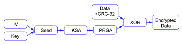 WEP is an algorithm that was a part of the original IEEE 802.11 specification with the design goals of preventing disclosure and modification of packets in transit and providing access control for the network. It uses the RC4 algorithm from RSA Security which was first designed in 1987 and kept as a trade secret until it was leaked on a mailing list in 1994. RC4 is a symmetric cipher, i.e. the key that encrypts the traffic is the same key that decrypts the traffic. It is also a stream cipher, meaning that it creates a stream of bits that are XORed with the plaintext (original data) to create the ciphertext (encrypted data). When the data reaches the other end, the same stream of bits is XORed with the ciphertext to retrieve the plaintext. RC4 uses a pseudo-random generation algorithm (PRGA) to create a stream of bits that are computationally difficult for an attacker to discover. This same stream of bits is reproduced at the other end to decrypt the data. Since RC4 is not supposed to be reused with the same key, the WEP designers added an Initialization Vector (IV) which is a value that changes for each packet. The IV is concatenated with the WEP key to form the WEP seed. Figure 1 outlines this process visually.