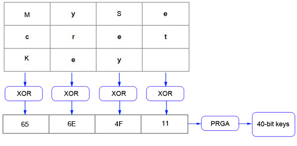 These programs are supposed to create a set of random keys based upon ASCII input. The algorithm that is often used by these programs is the Neesus Datacom key generation algorithm. This algorithm takes a string of ASCII characters as input, arranges them in a two dimensional array with four characters in a row, and then XORs all of the column values together in sequence to get a 32-bit output value. The 4 byte (32-bit) output value is then fed through a PRGA which generates the 40-bit secret keys. See Figure 3 for a visual representation.