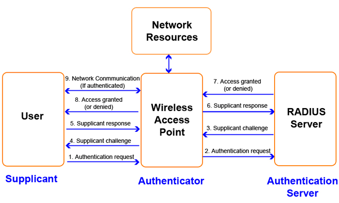 802.1x is a port authentication protocol that was originally created for wired networks. Switches, for example, can use 802.1x to authenticate a device before it allows the device access to a port. Once the authentication process has been successfully completed , access is granted to the device. There are three main components to the 802.1x authentication process: the supplicant, the authentication server, and the authenticator. The supplicant is the computer or device that wishes to have access on the network. The authentication server is the computer that performs the authentication. One of the most common types of servers that perform this task is a RADIUS server. The authenticator is the device that sits between the supplicant and the authentication server. In the example above, the authenticator is the switch. It is the point of access for the supplicant (Figure 5).